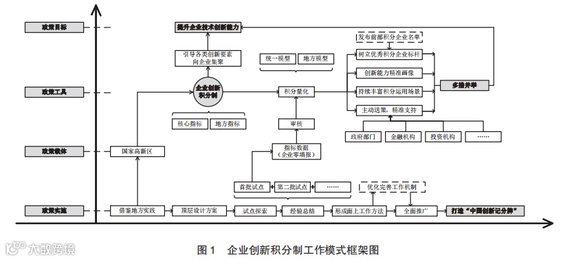 企业创新积分制是在借鉴张家港市创建国家创新型县市科技政策实践基础上提出的精准施策企业创新发展的新型政策工具,主要以提升企业技术创新能力为核心目标,重点依据企业创新积分量化评价结果,主动发现识别出研发能力强、发展潜力大、掌握关键核心技术的科技企业,尤其是初创早期科技企业,为其主动增信授信,有效撬动各类资源精准支持潜力企业,引导各类创新要素向企业集聚,加速企业发展成长。工作模式框架如图1所示。