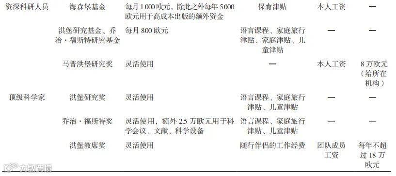 为吸引国际顶级科学家,洪堡基金会设立了洪堡研究奖、乔治·福斯特奖和洪堡教席奖。洪堡研究奖和乔治·福斯特奖表彰国际上有新发现、提出新理论或独到见解、对所在学科产生重大影响、有望在未来继续取得突破的科研人员,基金会邀请获奖者与德国的研究机构进行6~12个月的研究项目合作,可以灵活分几个时间段在德国逗留。