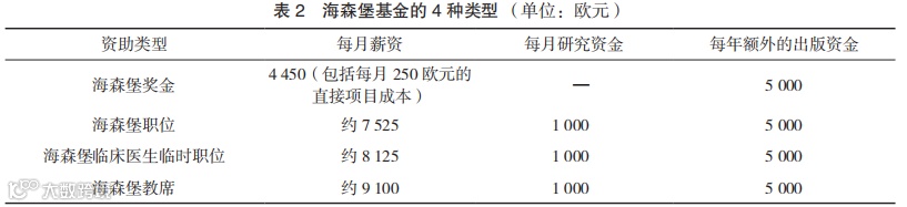 海森堡基金资助已获得教授资格或同等资质的科研人员,包括4种资助类型(见表2)。受资助者需提供所在机构的项目支持或合同声明,资助期限最长为5年,且低等级可以向高等级流动。海森堡教席受资助者所在的大学需承诺,如果受资助者在资助期结束后通过了德意志研究联合会和大学的评估考核,则将该受资助者晋升为终身教授。