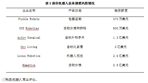 其次,马萨诸塞州机器人产业获得了高额度企业融资。根据《机器人商业评论》数据,马萨诸塞州截至2019年9月的风险投资额度超过12亿美元。另外在企业并购类型中,西门子医疗和Corindus Vascular Robotics的企业并购价值超过11亿美元。高频率、高额度的风险投资有效地支撑了机器人前沿技术开发和新企业培育,不断为马萨诸塞州机器人产业集群增添发展动力。部分具有代表性的融资情况如表3所示。
