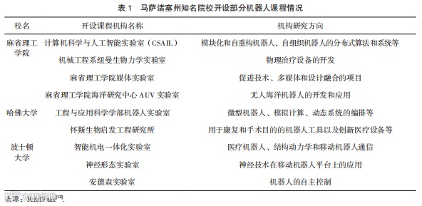 首先,拥有众多高水平的机器人研发大学与科研院所。马萨诸塞州拥有极其丰富的高等教育资源,在本地有麻省理工学院、哈佛大学、伍斯特理工学院等著名高等院校。由上海交通大学发布的软科世界大学排名(Academic Ranking of World Universities,ARWU)显示,这些高校的电力电子工程、机械、控制科学等机器人相关学科属于世界一流水平,能够持续提供高水平机器人科研成果。依据Kim的分析,麻省理工大学发表的机器人论文拥有世界最高的引文影响力。除了拥有一流的研发能力,2016年美国智库机构ABI研究还显示,在该州大波士顿都市地区拥有的50多所高等院校中,已经有超过16所开设了机器人相关课程(部分知名院校开设情况见表1),培养了规模庞大的机器人工程师群体等相关人才队伍,有力地支撑了当地机器人产业集群的发展。