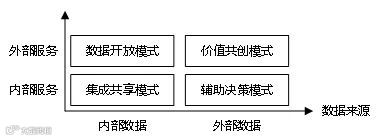 按照数据价值密度的不同,可将电力大数价值创造过程分为三个阶段:价值形成阶段、价值增长阶段与价值体现阶段。对电力电网企业内部与外部不同来源的数据,按内部、外部不同服务维度组合,形成四种价值创造模式,如图3所示。