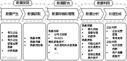 通过抽取共性的认知,电力大数据价值链可认为是通过从电力企业内部、外部获取各类型的数据,经过数据加工与分析,形成有价值的信息、知识,到辅助电力行业经营决策、提供服务,并产生经济与社会效益的过程。电力大数据价值链的关键环节可分为数据产生、数据获取、数据存储和集成管理、数据分析和价值生成五个环节,覆盖了从数据发现、数据聚合到数据利用的全过程,如图2所示。