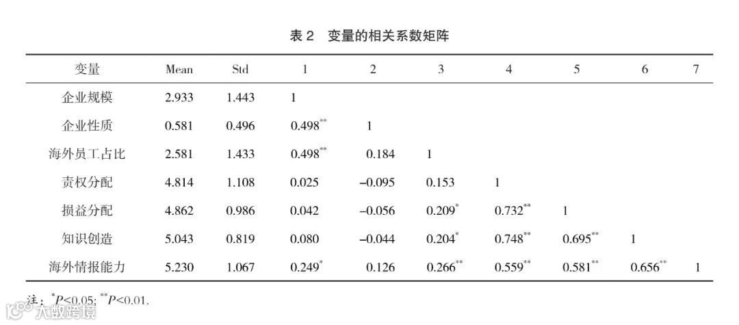 表2总结了各变量之间的相关系数,可以看出,跨国企业内部的责权分配和损益分配与知识创造和海外情报能力均具有显著的正向相关关系,初步判断,跨国公司的知识治理、知识创造和海外情报能力之间具有显著相关性。就控制变量而言,企业规模与企业性质和海外员工占比均在0.01的水平上显著,表明本次调查中,国有企业的规模较大,且海外员工数量较多,其次,企业规模与海外情报能力的关系在0.05的水平上显著,海外员工占比与损益分配和知识创造在0.05的水平上显著,与海外情报能力在0.01的水平上显著。后续分析将通过更严谨的方式对这些关系做进一步检验。