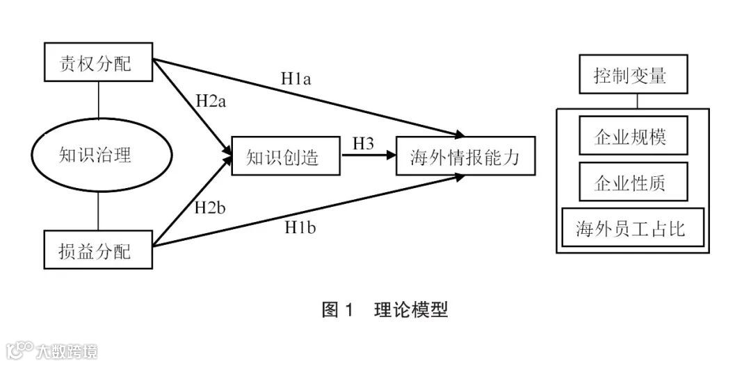 知识基础论认为企业不仅是一个知识整合的“机器”,而且是能充分利用员工知识进行持续知识创造的有机组织,为企业能力塑造奠定基础;知识员工在知识创造体系中是关键的主体。在知识治理观的框架下,良好的责权分配和损益分配能够推动海外情报工作中的知识主体积极寻求海外情报任务的内部合作,激发其主动进行知识共享,释放内隐的情报知识,并在组织内部进行转移,企业得以更大限度地利用其拥有的知识,从而实现海外情报工作中的知识创造。企业的知识和能力相互依存,知识的流通和共享促进企业知识创造,提升知识活动的效率,从而支撑起企业海外情报能力的构建。因此,提出如下假设: