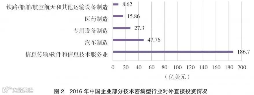 伴随着对外直接投资的热潮,技术寻求型对外直接投资也呈现迅速增长的态势。虽然对于技术寻求型对外直接投资没有明确统计口径,但从实践来看,技术寻求型对外直接投资主要集中于技术密集型行业和高端制造业(见图2)。仅在2016年信息传输/软件和信息技术服务业的对外直接投资规模就超过百亿美元,而汽车制造、计算机/通信及其他电子设备制造、专用设备制造、医药制造、铁路/船舶/航空航天和其他运输设备制造等高端制造业的投资流量合计达到138.82亿美元,达到制造业对外直接投资占比的47.8%。