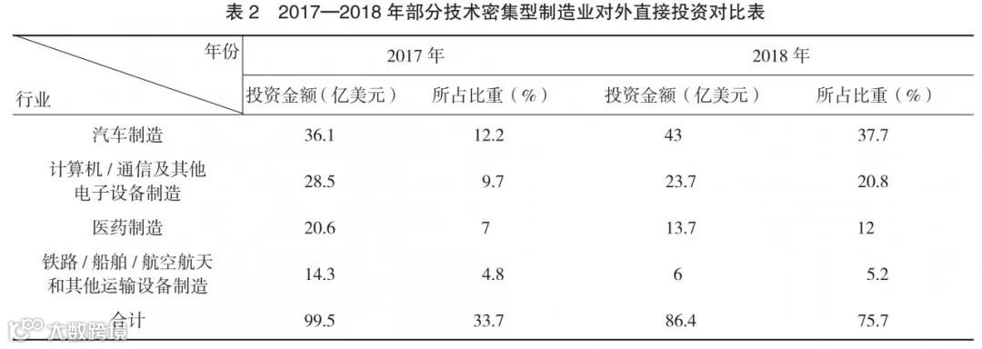 2018年中国制造业对外直接投资191.1亿美元,同比下降35.2%,主要投向是汽车制造、计算机/通信及其他电子设备制造、专用设备制造、医药制造、铁路/船舶/航空航天和其他运输设备制造、金属制品等领域。在制造业中部分技术密集型行业的投资绝对额有所下降,但所占比重不减反增(见表2)。