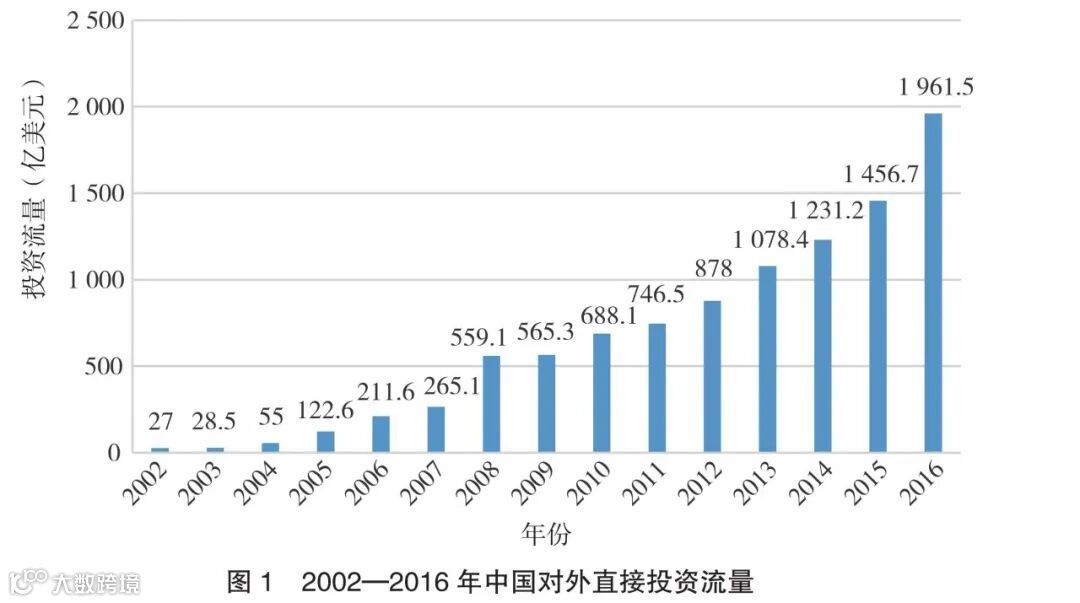 2000年中国正式提出“走出去”战略,2001年加入世界贸易组织,中国迈出了全球化的重要一步,中国企业对外直接投资热情高涨,对外直接投资规模显著增长。自2002年中国建立对外直接投资统计制度以来,中国对外直接投资流量持续快速增长14年,截至 2016年,年均增速高达35.8%。根据相关数据(见图1),仅2016年中国对外直接投资就达到了1961.5亿美元,为历史最高纪录,投资总规模为13573.9亿美元,均位居世界第二位。