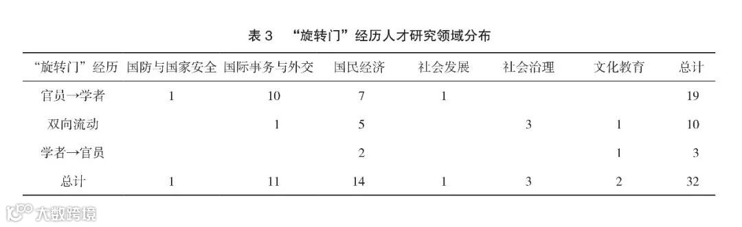在所有具有“旋转门”经历的32名学者中,研究领域为“国民经济”的14人,“国际事务与外交”的11人,社会治理有3人,文化教育2人,国防与国家安全1人,社会发展1人。