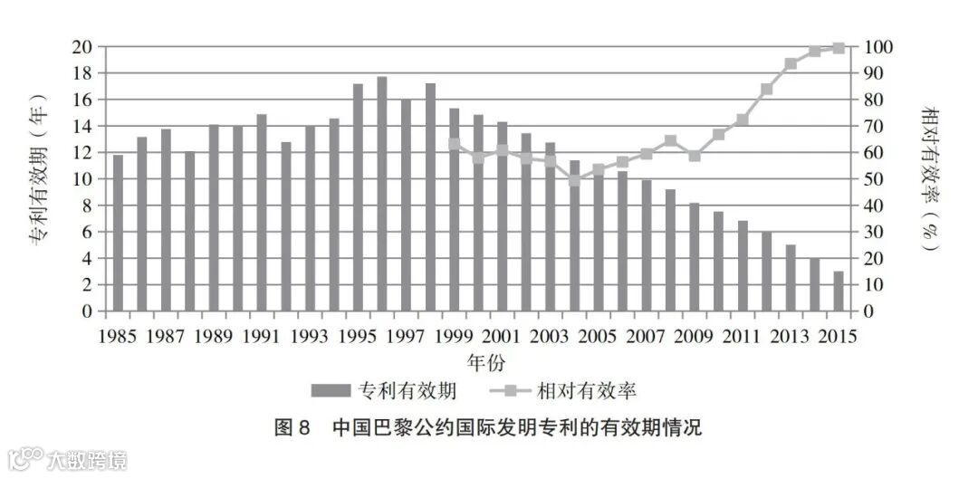 授权发明专利的法定有效期为20年,从专利申请日开始计算。本研究是针对专利家族进行分析,因此,在一个专利家族的所有授权发明专利中,以缴纳专利费时间最长的那件专利的有效时间作为整个专利家族的有效期。因为维持一项专利需要按当地知识产权管理部门规定按时缴纳专利维护费用,专利权人有时出于市场、成本等考虑会有选择性地保留主要目标市场的专利权,而放弃在其他国家/地区的专利权。1985—1998年申请的专利均已超过20年的法定期限而失效,这些专利的专利有效期居于11~18年间,平均专利有效期为14.51年。1999年至今的授权专利仍在法定20年专利权期限内,目前已失效的专利以其实际有效期计算,而目前仍有效的专利则以检索时间和申请时间的差计算。从图8可见,随着专利申请时间的越来越近,平均专利有效期也越来越短,但这不能表明近年申请的专利的价值就一定小于早年专利,不同年度的有效期并没有直接可比性。