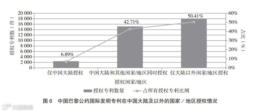 国际专利申请的主要目的之一是占据本国之外的技术和市场垄断权利。从图6可见,巴黎公约发明专利的授权专利中,仅在中国大陆获得授权的专利比例较低,不到7%;而在大陆以外国家/地区获得授权的比例高达93%以上。这与中国PCT发明专利中有42.96%仅在中国大陆获得授权的情况完全不同。表明中国申请的巴黎公约专利的整体质量较PCT专利更高,许多PCT专利未体现出国际专利申请的价值。