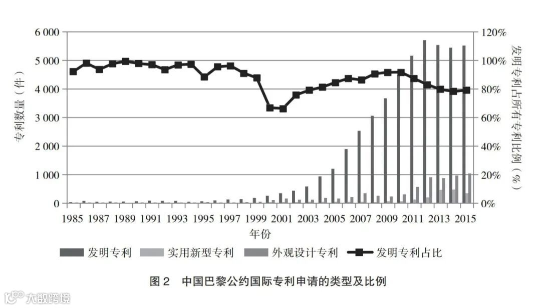 与实用新型和外观设计专利比较,发明专利价值相对更高,因为专利审查授权机构对发明专利的创新程度要求更高、保护周期更长。从图2可见中国巴黎公约发明专利的占比起伏较大。2000—2001年间,达到历史谷值,发明专利占比仅为67%;然后持续增长到2010年的高值92.4%之后又不断下滑,直至目前稳定在80%左右。这与PCT发明专利的占比十余年来呈现平稳上升趋势且近年一直处于约90%占比的情况不同。以上区别可能与两种申请途径所受理的专利类型有关,因为外观设计类专利不被PCT途径受理,而只能走巴黎公约申请途径,导致巴黎公约专利中发明专利的占比相对较低;而每年外观设计类专利数量并不十分稳定,导致其在巴黎公约专利中的占比高低起伏不定。