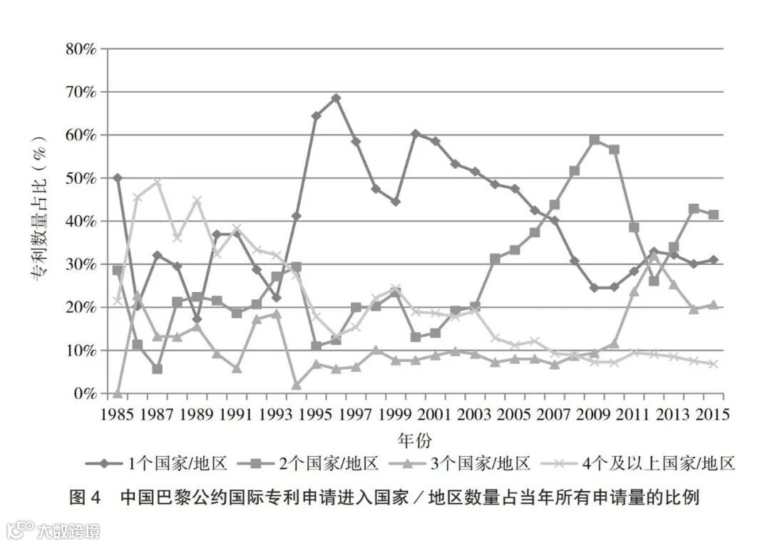 从图4可见,进入不同数量国家/地区的中国巴黎公约专利占当年所有申请量的比例在近30年间的变化起伏较大。近10年,该比例大概按照进入2个、1个、3个、4个及以上国家/地区的比例从大到小排列。总的来看,进入2个和3个国家/地区的专利数量呈现增长趋势,而进入1个和4个及以上国家/地区的专利数量呈现减少趋势。因为进入4个及以上国家/地区申请授权的专利通过PCT途径申请更合适,而仅在中国大陆以外的1个国家/地区申请专利授权的情况也并不多见。我们研究发现,PCT专利中有6.37%在世界知识产权组织申请国际专利后,没有进入任何国家/地区申请授权,有40.08%的PCT专利仅在中国大陆申请授权,即共有46.45%的中国PCT专利完全没有必要申请国际专利。PCT专利中仅有18.28%去3个以上的国家/地区申请了专利,这一部分专利才真正具有申请PCT专利的价值和意义。总的来说,从进入的国家/地区数量情况来看,巴黎公约专利较PCT专利更为合理。