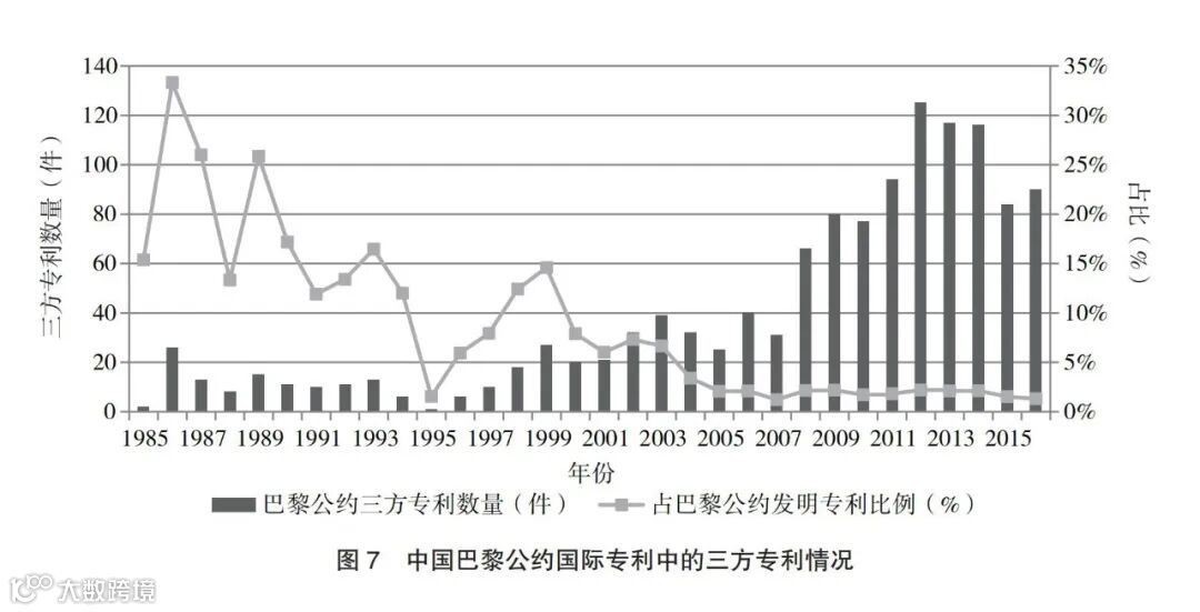 三方同族专利(Triadic Patent Families)是研究全球最具市场价值和高技术含量的专利状况的重要分析指标,指来自于欧洲专利局、日本专利局、美国专利与商标局保护同一发明的一组专利。中国科学技术部在《中国科学技术指标》中定义三方专利为:在欧洲专利局和日本专利局都提出了申请并至少已在美国专利商标局获得发明专利权的同一项发明专利为三方专利。如图7所示,在中国成为PCT成员国以前,巴黎公约专利中的三方专利比例大多在10%~30%之间波动,但在中国开始申请PCT专利的1995年,当年巴黎公约专利的三方专利率跌到谷值,这可能是受到PCT专利申请的影响;之后缓慢上升又再次下降,近十余年该比例稳定在2%左右。由于巴黎公约专利更适合在少量国家/地区申请,故在PCT国际专利途径出现后,目标国家/地区较少的专利多选择更方便省时和节约费用的巴黎公约途径申请。相应地,由于进入国家/地区过少,难以达到三方专利对国家/地区数量的要求,故巴黎公约专利中的三方专利比例较低。这可能也是PCT专利中的三方专利比例相对较高,维持在7%左右的原因。不过总的来说,与美国、日本等比较,中国专利的三方专利率还非常低。