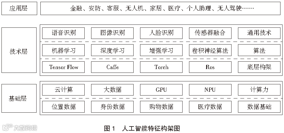 依据研究界对人工智能的模拟程度,目前我国正处于弱人工智能阶段,弱人工智能强调的是人工智能的工具性,其主要思路是借鉴人类的某些智能行为,减轻人类在某些领域智力劳动的负担。人工智能从架构上分为3层,即基础层、技术层和应用层。基础层主要是为人工智能技术(含算法)提供计算能力以及数据输入,包括超算/云计算平台、GPU/FPGA/NPU等人工智能芯片、相关的数据资源以及大数据工具。技术层是整个人工智能的核心,包括算法和人工智能技术,该层在基础层的基础上开发算法模型,并通过海量识别训练和机器学习建模,开发面向不同应用领域的技术,如语音识别、图像识别等。应用层是将人工智能技术与应用场景结合起来,实现商业化落地,这个部分是国内人工智能发展最为活跃的领域,主要应用包括智能安防、智能投顾、智能客服、智能家居、无人驾驶、机器人等多个领域,具体构架见图1。