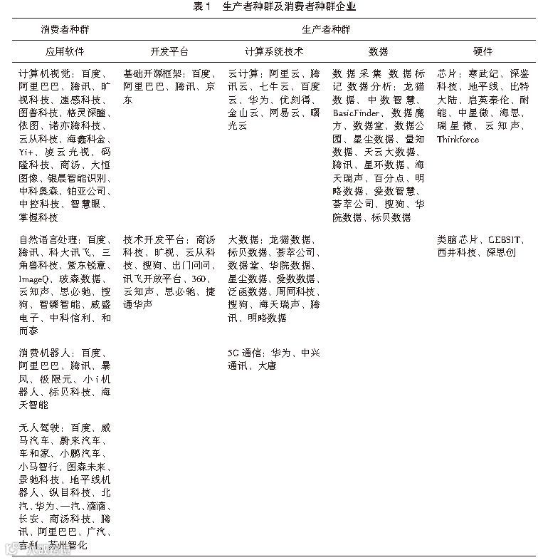 消费者种群包括将人工智能技术应用于各产业的企业组织,是创新成果的重要产出器。例如从事计算机视觉的百度、阿里、旷世、速感科技;从事自然语言处理的科大讯飞、三角兽科技;无人驾驶汽车的百度、腾讯;消费机器人的暴风、极限元、小i机器人等。通常在每个细分领域都有几家龙头企业以及若干中小企业,龙头企业及中小企业之间的交互作用形成企业创新网络,从而形成各领域内的局部创新生态系统,最终推动整个人工智能产业的创新生态系统构建。生产者种群及消费者种群企业见表1。