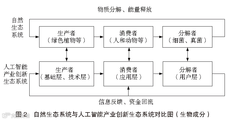 在自然界的生态系统中,生产者即绿色植物,为消费者、分解者提供物质和能量;消费者即人和动物等,以生产者为食物,获得自身生长、发育、繁殖所需的物质和能量;分解者即细菌、真菌等微生物,将死亡的动植物分解成简单的无机物,这些物质再次被绿色植物吸收和利用。在人工智能产业的创新生态系统中,需要特别注意的是,消费者不是我们通常所说的“购买和使用人工智能产品的人”,而主要是指将人工智能技术应用到具体产业的各种应用层企业、高校、科研院所等。此时,生产者、消费者、分解者的界限不是那么清晰,可能出现交互或者重叠的状况。原则上,人工智能生产者从事基础层、技术层的研发活动;消费者将人工智能技术应用于各产业,形成“人工智能+”产业;分解者即用户层使用、购买相关产品,并将信息反馈给生产者,同时资金回流,使整个创新生态系统得以持续发展。