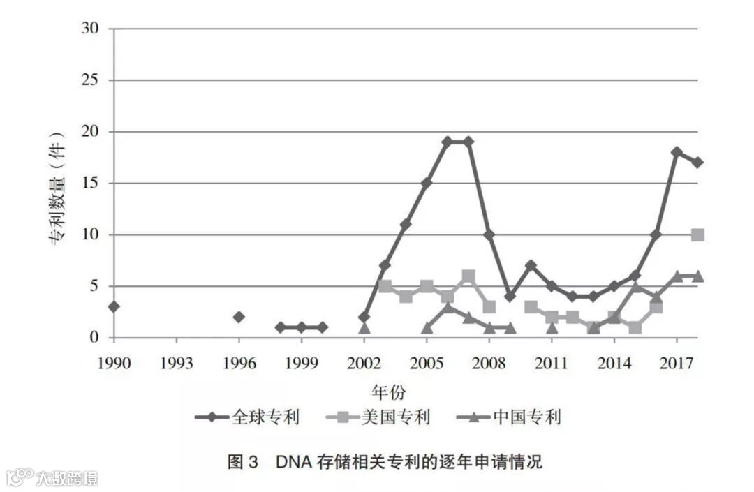 虽然中国的第一件DNA存储技术相关专利在2002年申请,比美国的第一件相关专利早了一年,但在2003年、2004年、2010年及2012年,中国并没有DNA存储技术相关专利的申请。从2015年开始,中国才加大了对DNA存储技术的应用研究。2015年至2018年,中国DNA存储技术相关专利每年申请量达到5件左右。