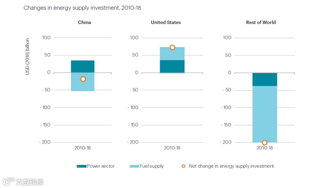 2018年,全球能源投资总额超过1.8万亿美元,与2017年持平。电力行业连续第三年吸引的投资超过石油和天然气行业。整体能源投资涨幅最大的是美国,其增长得益于上游供应(特别是页岩气)支出的增加以及电力网络支出的增加。这一增长缩小了美国和中国之间的差距,不过中国仍然是世界上最大的投资目的地。