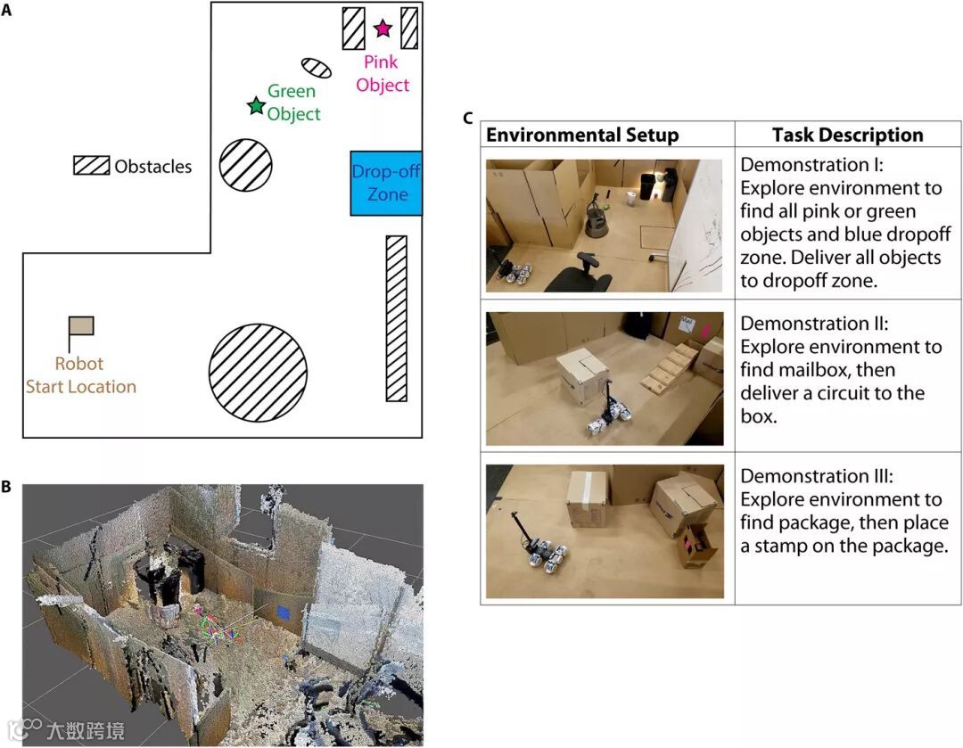 (A) 环境图. (B) 由视觉SLAM构建的环境1. (C) 环境设置和任务描述.