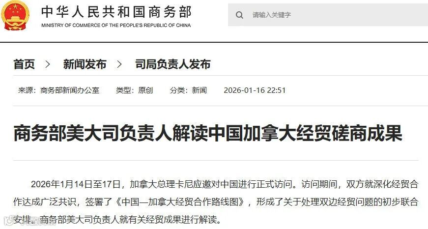 应李强总理邀请,加拿大总理卡尼于2026年1月14日至17日对中国进行正式访问。两国领导人举行会谈并发表联合声明,主要内容如下: