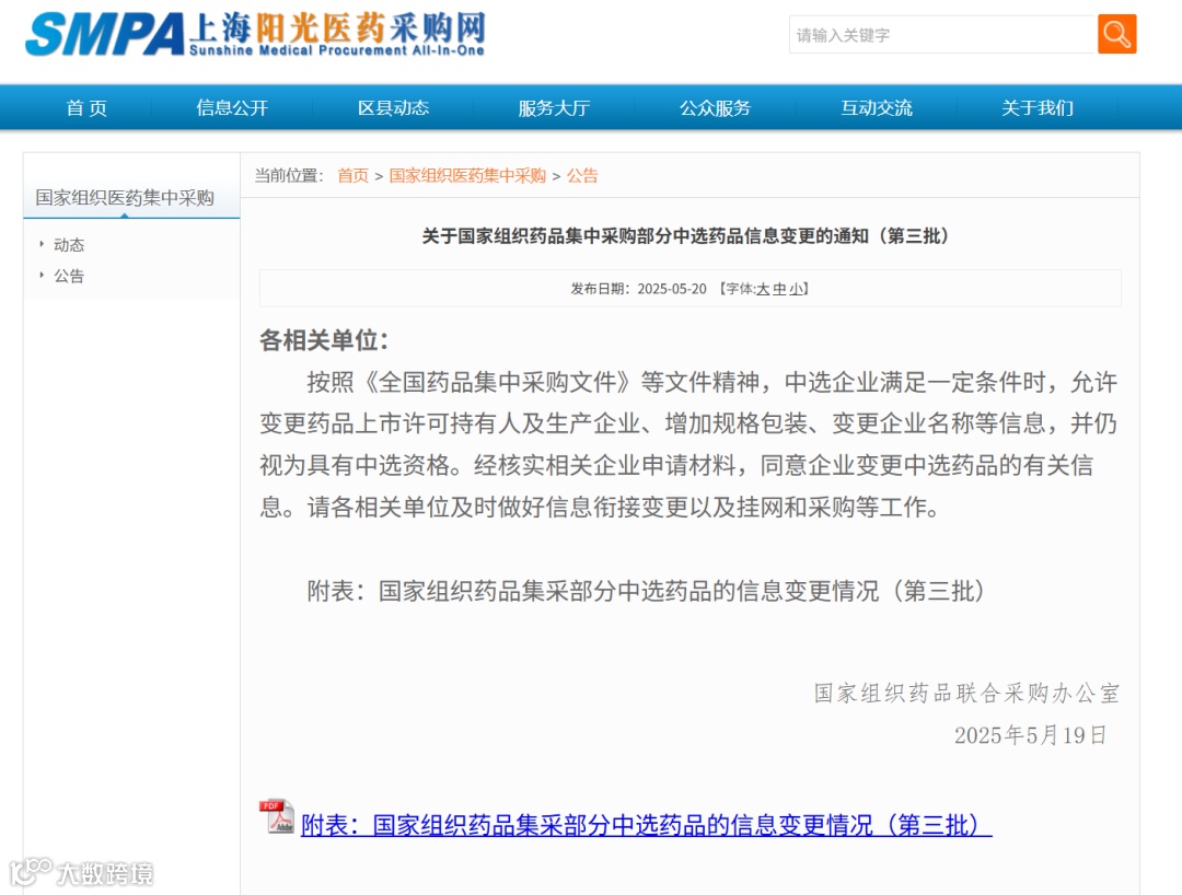 5月20日,国家组织药品联合采购办公室发布通知,国家组织药品集中采购部分中选药品信息变更的通知(第三批)。