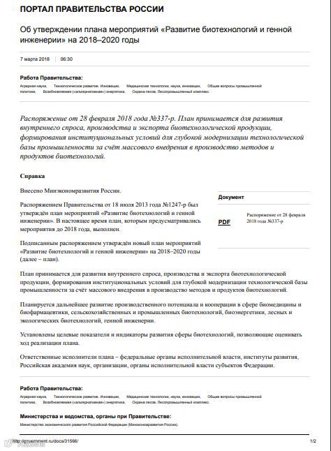 关于批准《2018-2020年生物技术和基因工程发展措施计划》的政府令(部分)