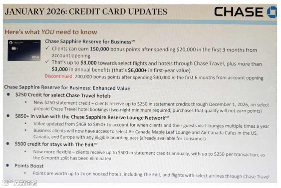 据合作伙伴消息,Chase Sapphire Reserve Business 卡200,000点Ultimate Rewards积分开卡奖励将于2026年1月22日线上截止;Chase线下网点申请截止日为1月26日。此后奖励将降至150,000点,大幅缩水。建议符合条件的用户尽快提交申请。