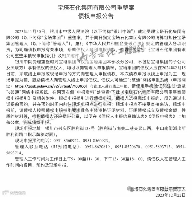 彼时,2023年11月16日,宝塔实业公告称,公司近日收到第一大股东宝塔石化关于其被申请破产重整的相关文件,获悉宝塔石化被债权人向银川市中级人民法院申请破产重整。