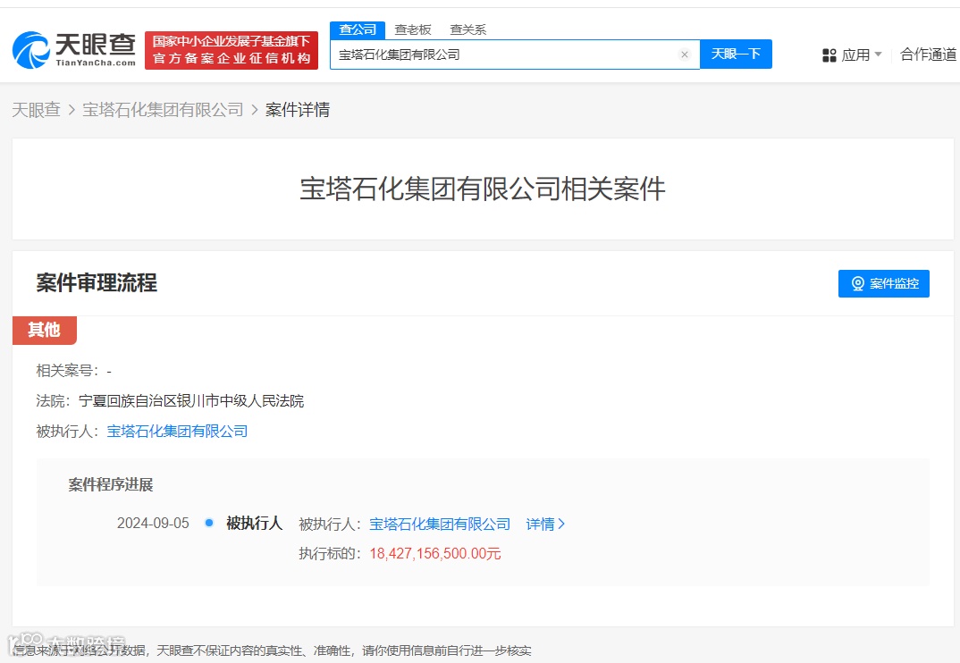 近日,宝塔石化集团有限公司新增一则被执行人信息,执行标的184.2亿余元,执行法院为宁夏回族自治区银川市中级人民法院。