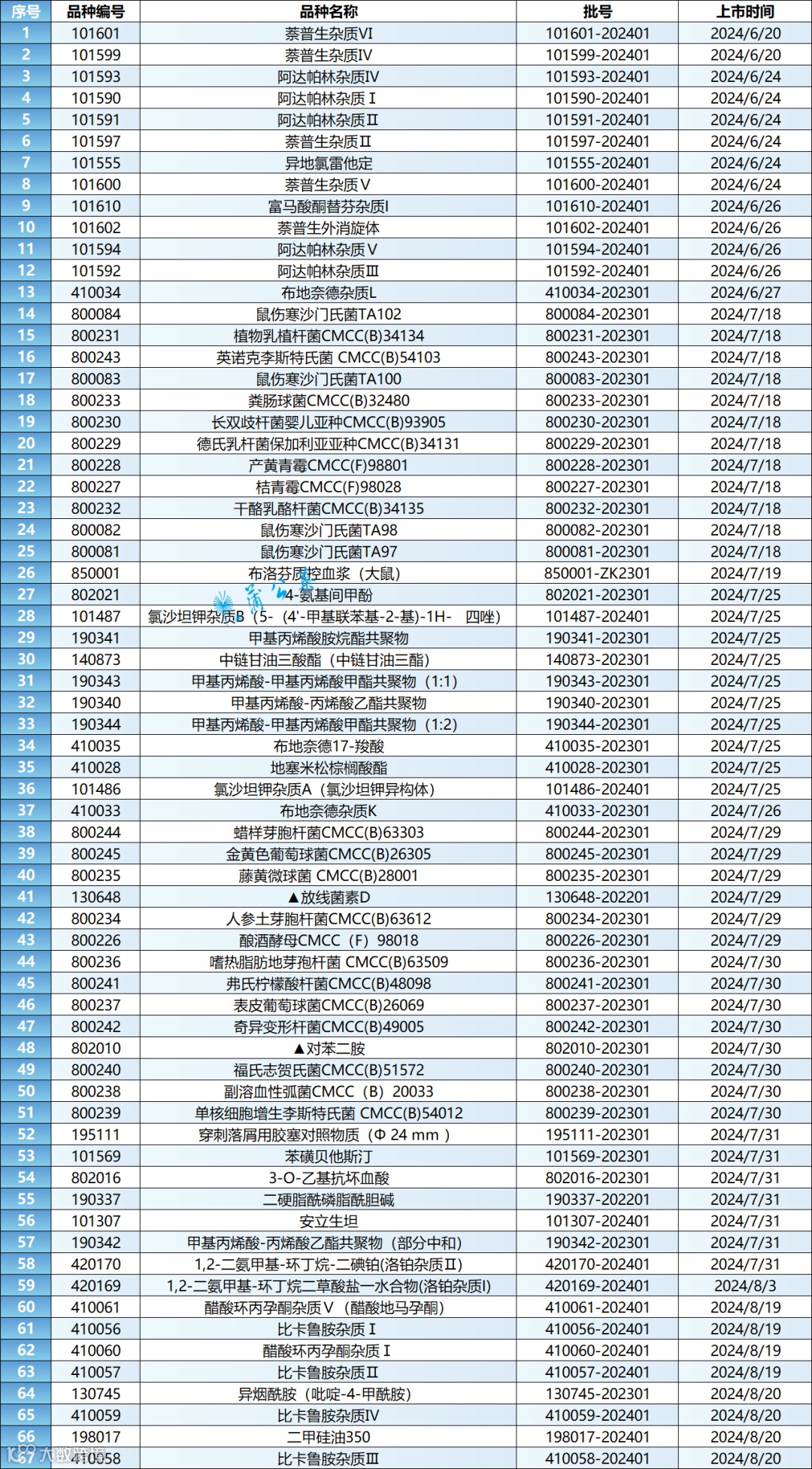 2024年09月12日,中检院发布了国家药品标准物质供应新情况(2024年第四期),本次更新包括67个上市的新品种、96个已换批品种和5个停用品种名单。