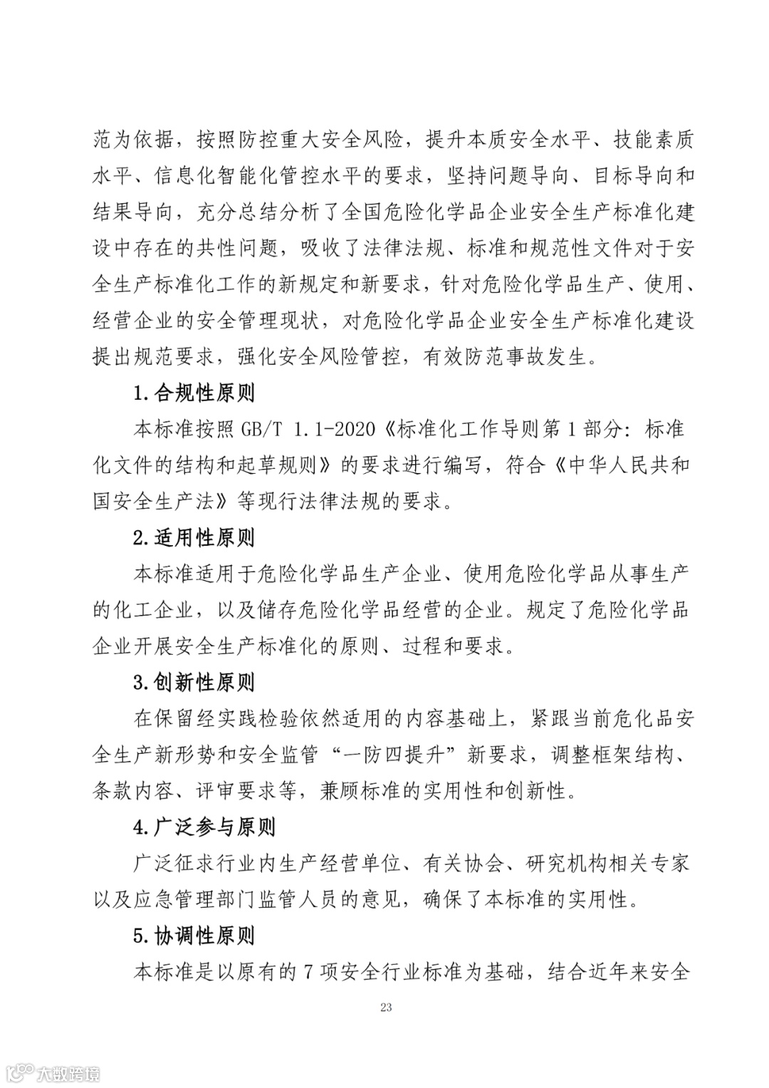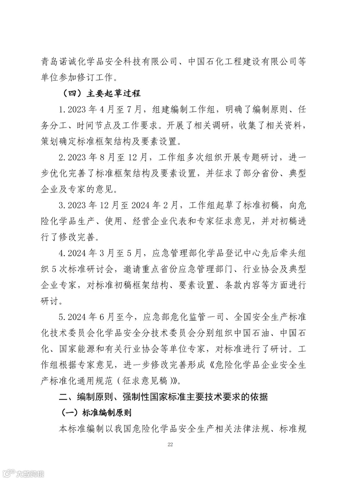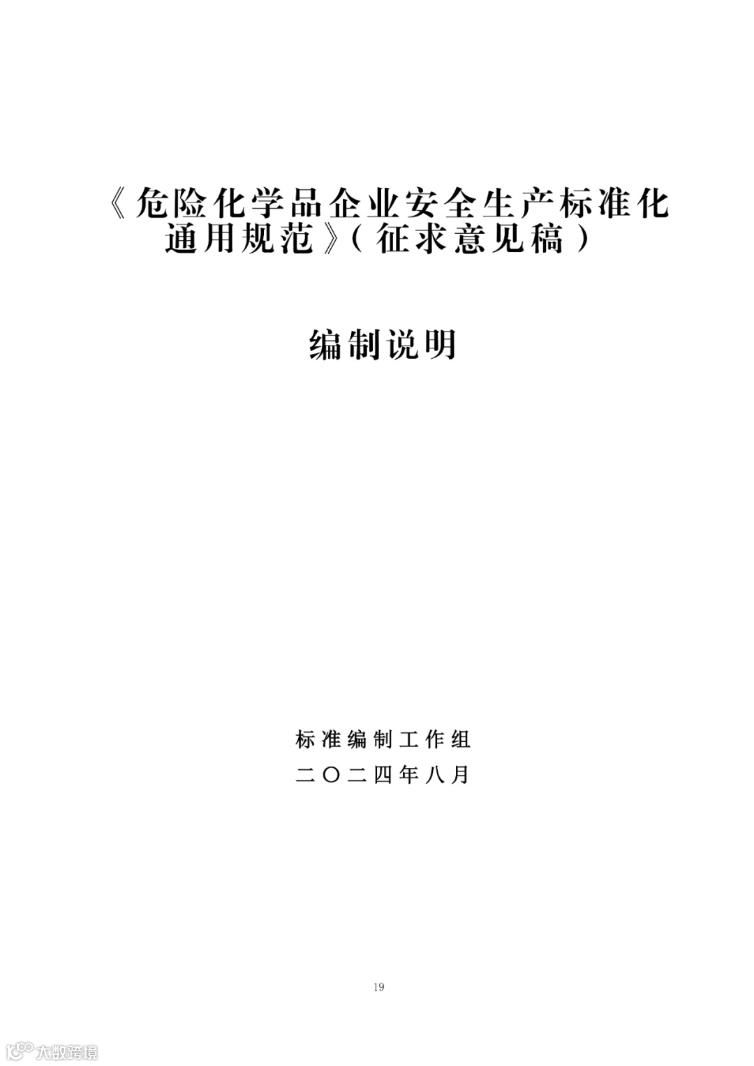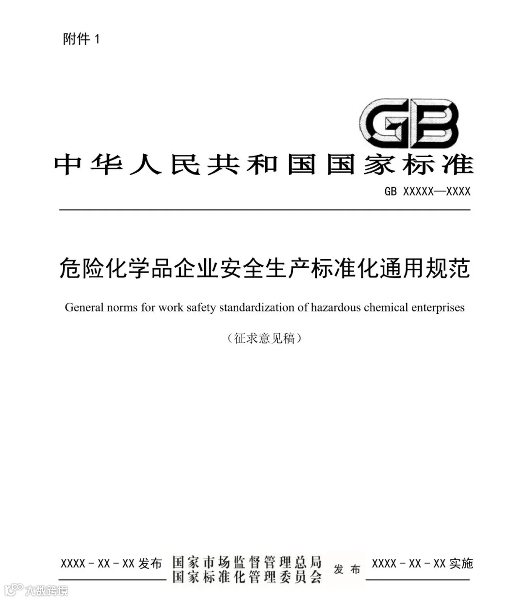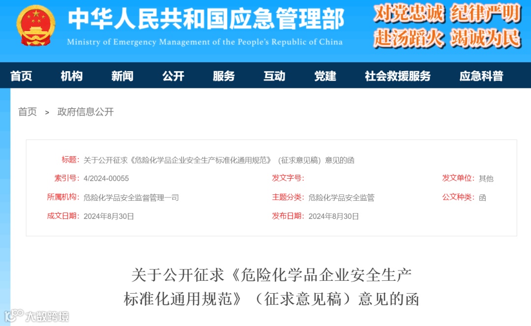 为推动危险化学品企业加强安全生产标准化建设,应急管理部危化监管一司整合有关行业标准,组织制定了《危险化学品企业安全生产标准化通用规范》(征求意见稿)和编制说明。现向社会公开征求意见,征求意见截止时间为2024年10月30日。