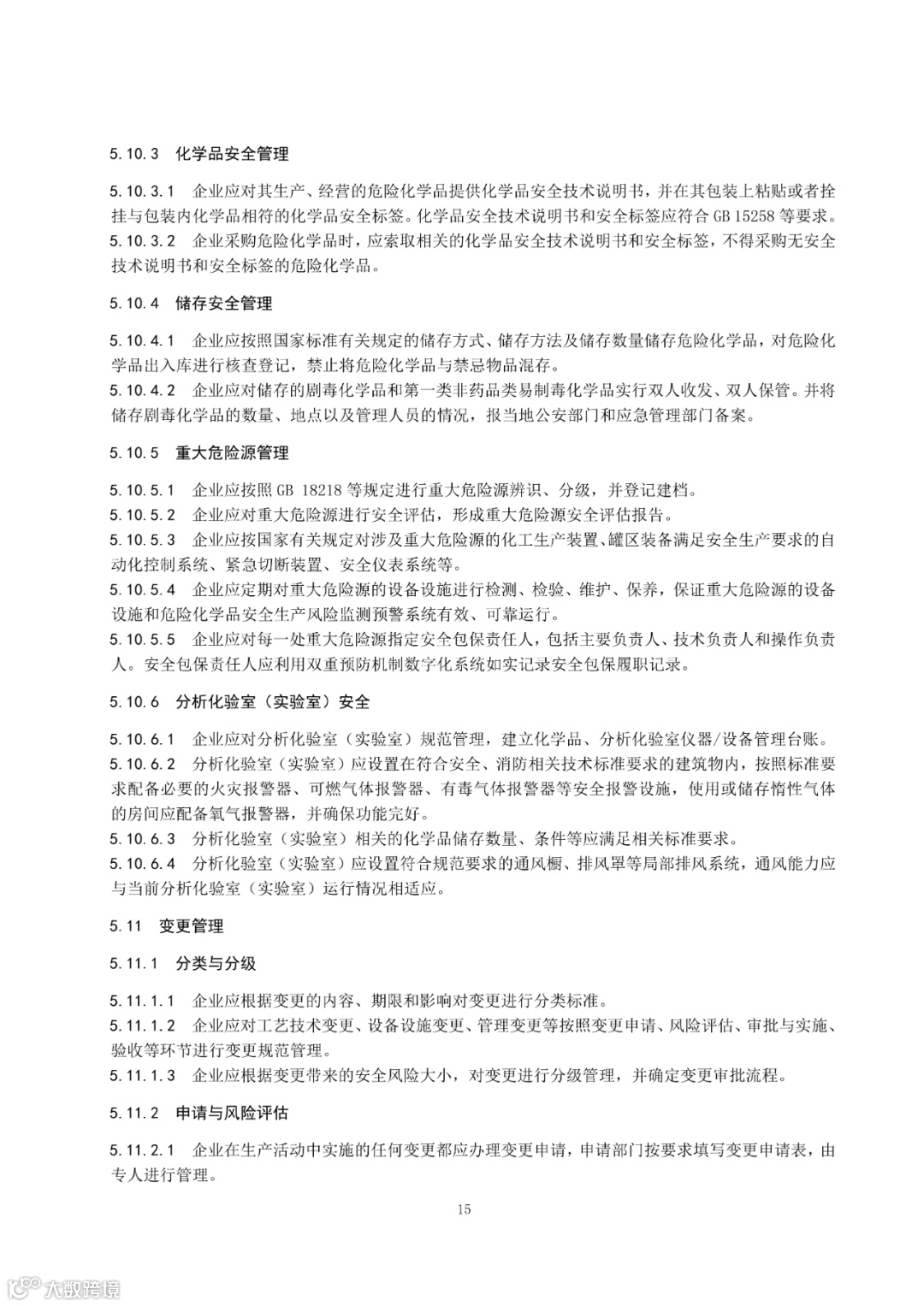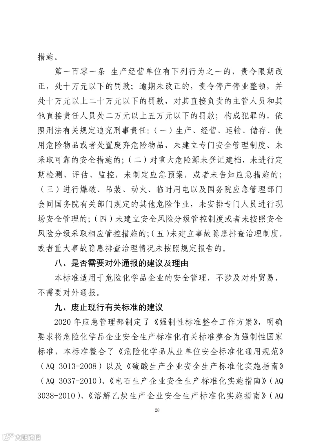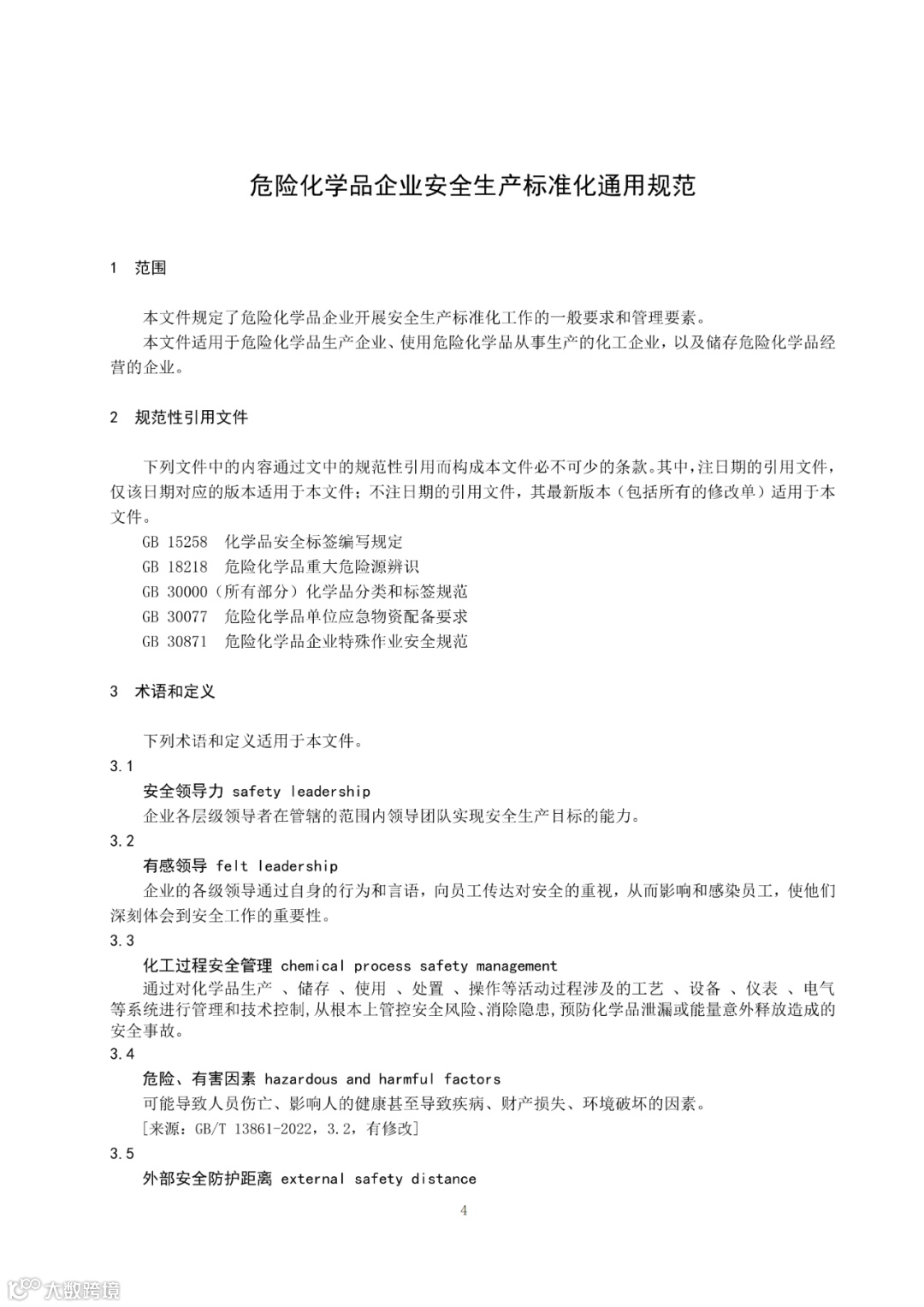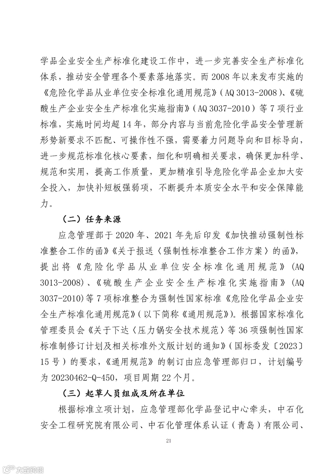 为推动危险化学品企业加强安全生产标准化建设,应急管理部危化监管一司整合有关行业标准,组织制定了《危险化学品企业安全生产标准化通用规范》(征求意见稿)和编制说明。现向社会公开征求意见,征求意见截止时间为2024年10月30日。