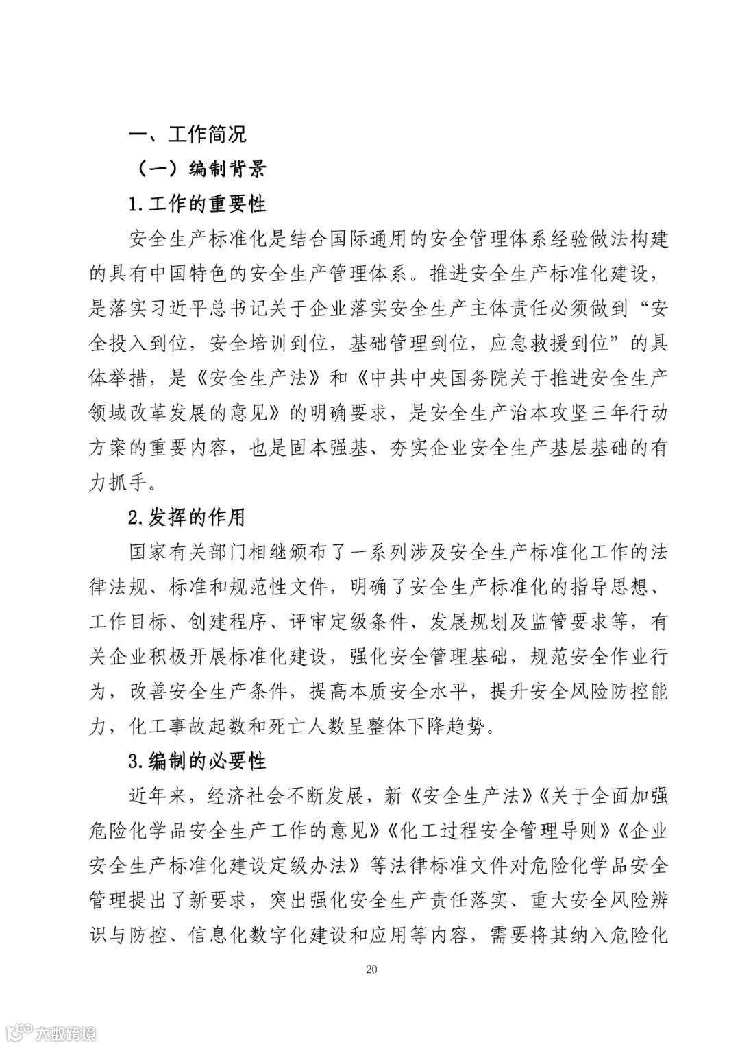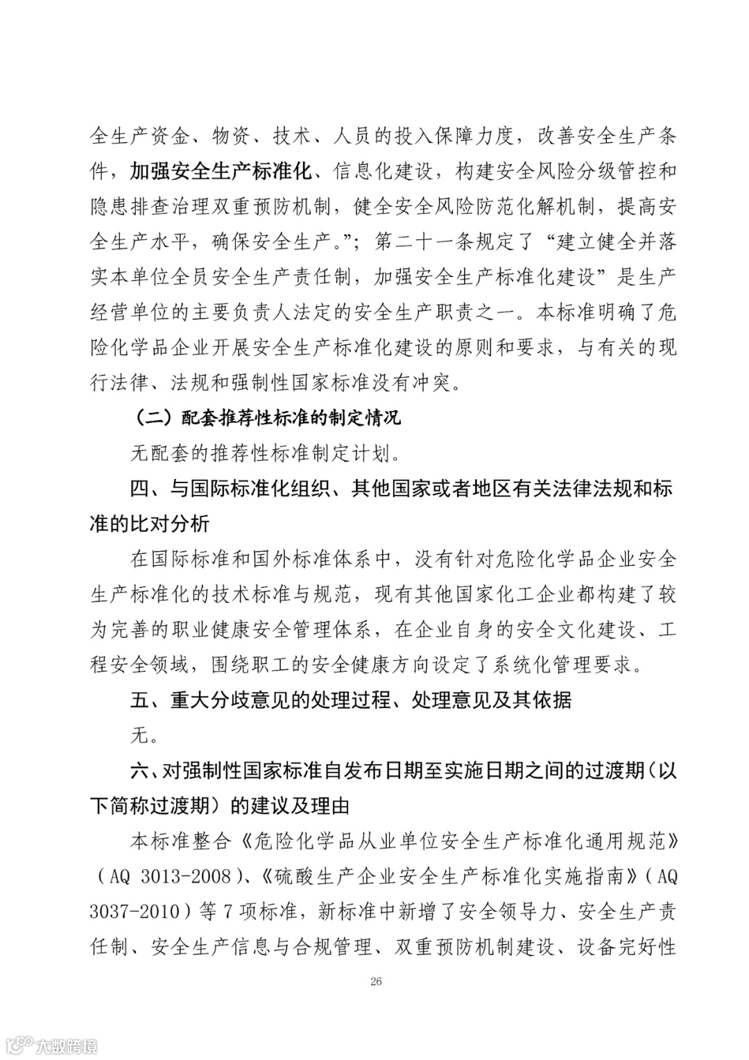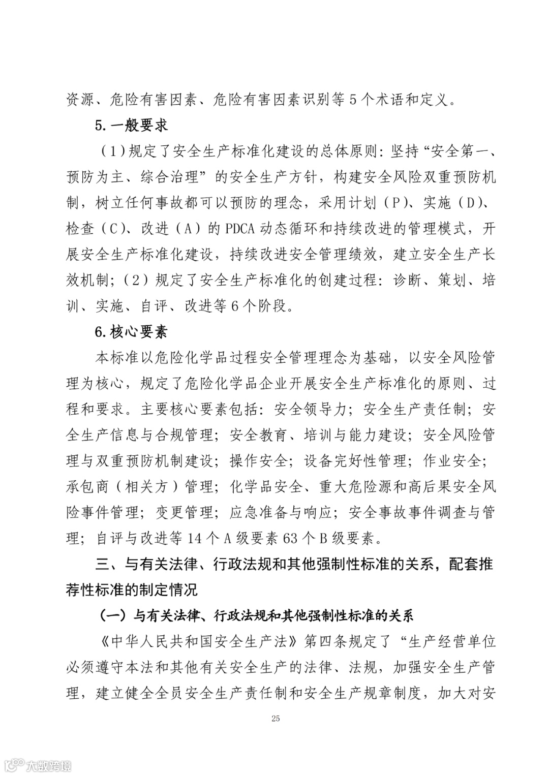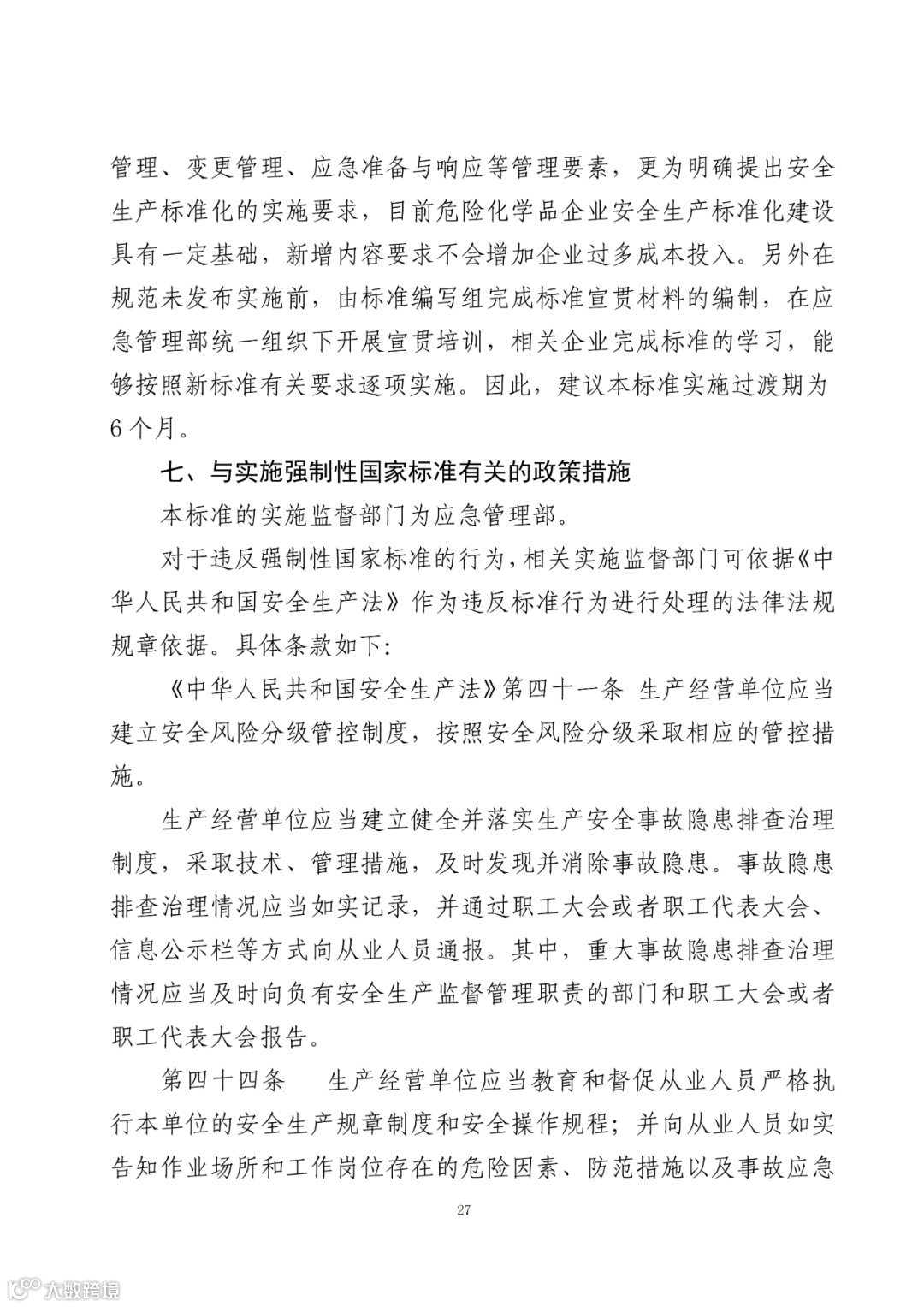 为推动危险化学品企业加强安全生产标准化建设,应急管理部危化监管一司整合有关行业标准,组织制定了《危险化学品企业安全生产标准化通用规范》(征求意见稿)和编制说明。现向社会公开征求意见,征求意见截止时间为2024年10月30日。