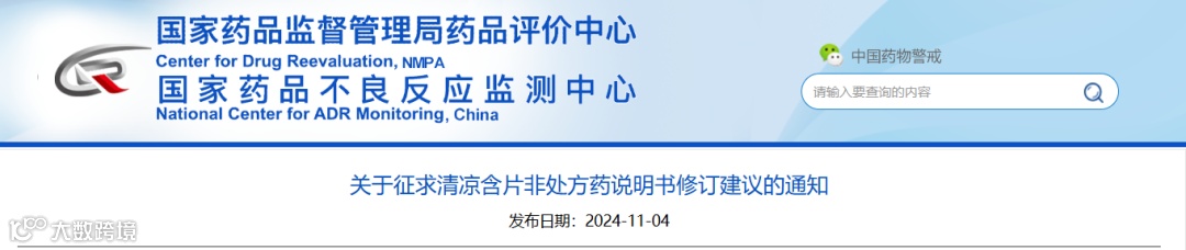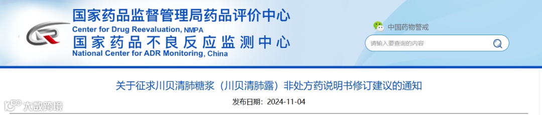 2024年11月04日,国家药监局不良反应中心发布了非处方药说明书修订建议征集的通知,涉及品种为清凉含片和川贝清肺糖浆(川贝清肺露),征集意见截止12月04日。