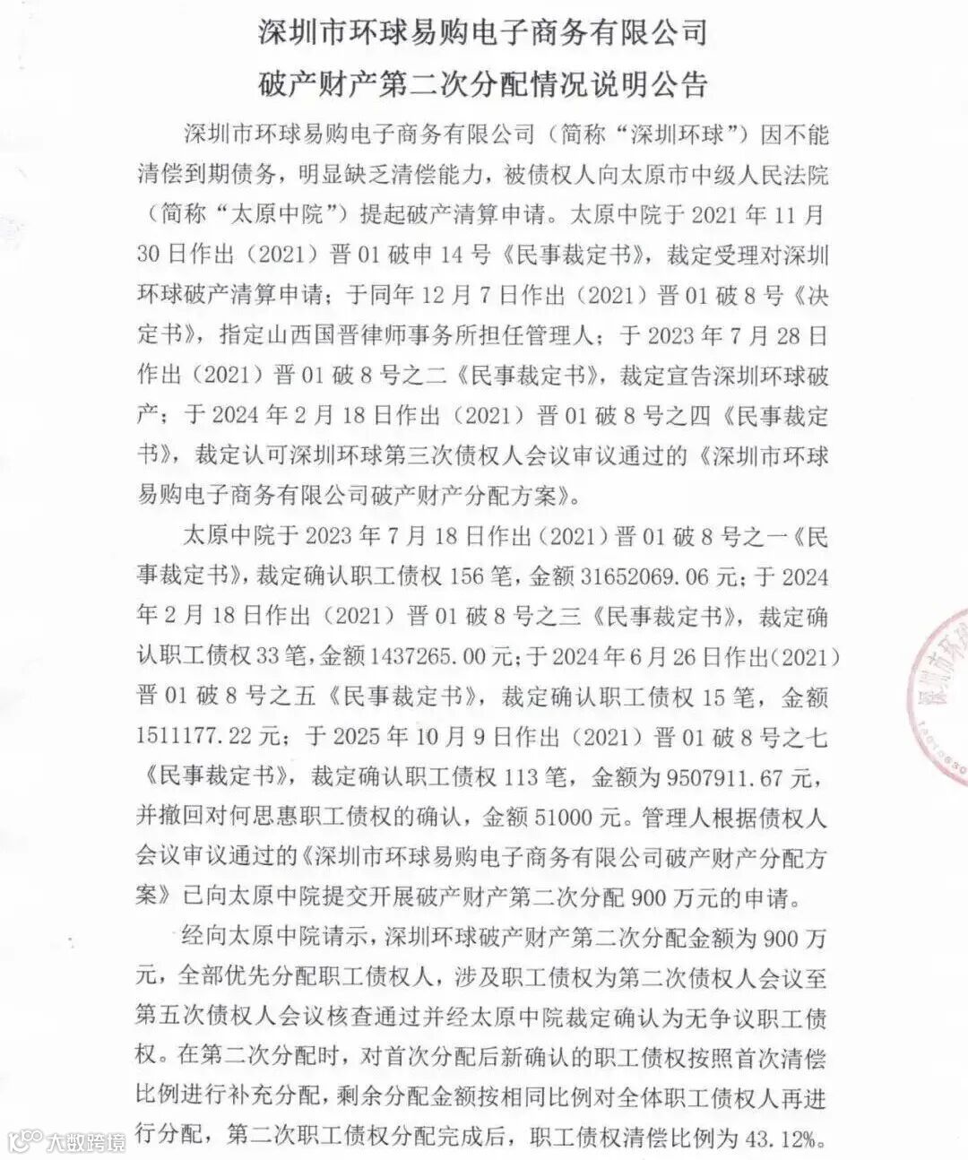 环球易购破产二次分配:900万元清偿职工债权,8.15亿元债务难解