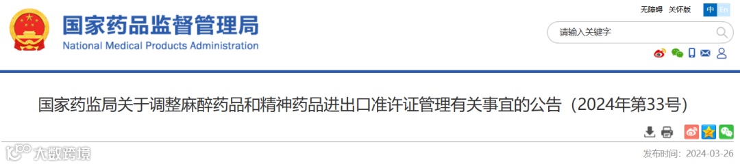 2024年03月26日,国家药监局发布了《关于调整麻醉药品和精神药品进出口准许证管理有关事宜的公告》,将电子提交申请资料相关流程及要求进行了说明。