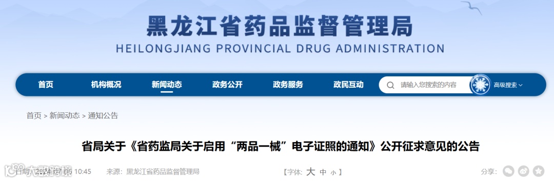 2024年07月05日,黑龙江药监局发布了关于《省药监局关于启用“两品一械”电子证照的通知》公开征求意见的公告,征求意见截止2024年8月5日。