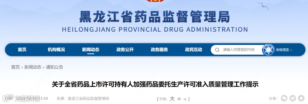 2023年12月11日,黑龙江药监局发布了关于全省药品上市许可持有人加强药品委托生产许可准入质量管理工作提示,提出要规范委托生产申报资料、要强化管理人员配备、要建立覆盖生产全过程的质量管理体系、要加强受托生产企业质量管理、要持续完善管理措施、要强化重点品种质量管理、要规范不良信用管理和要建立责任赔偿制度的“八要”工作提示。