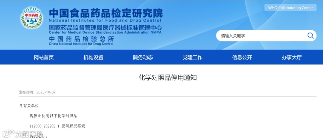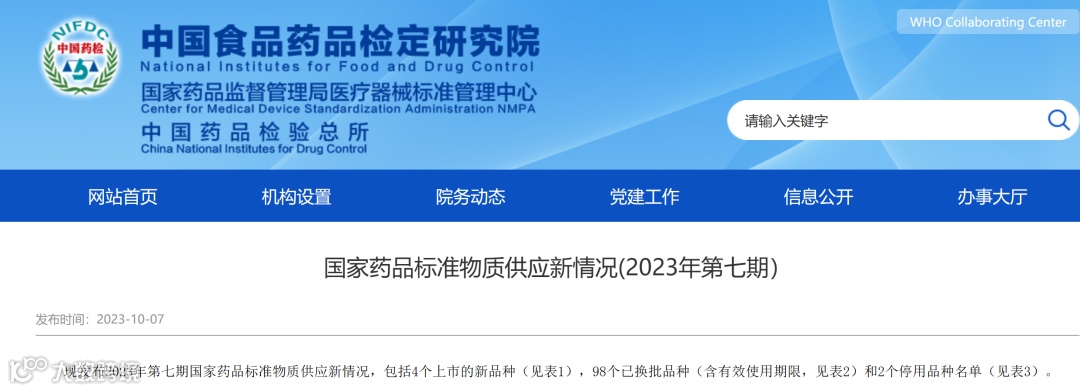 10月7日,中检院发布了两则国家药品标准物质供应情况,涉及国家药品标准物质供应新情况(2023年第七期)和化学对照品停用。
