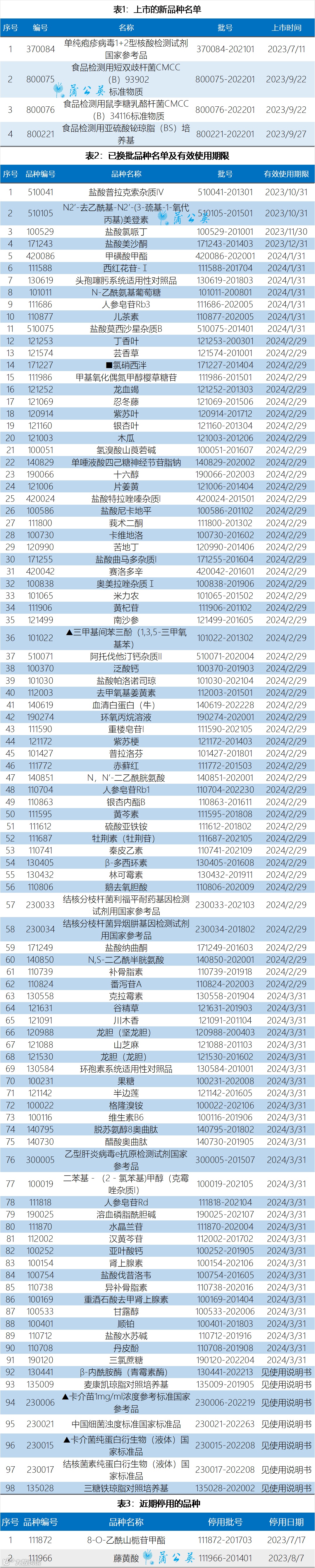 标准物质供应情况:包括4个上市的新品种,98个已换批品种(含有效使用期限)和3个停用品种名单。