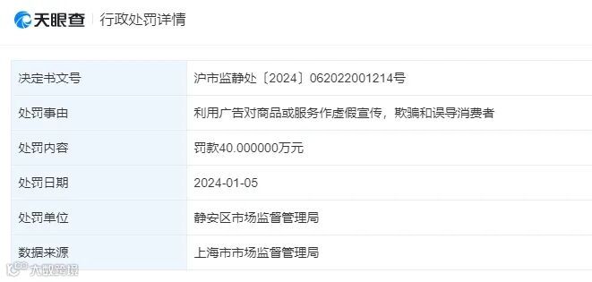 中国网财经2024年1月17日讯(记者李晚),据天眼查app,近日,药企百济神州因违法发布处方药广告被罚款40万元。