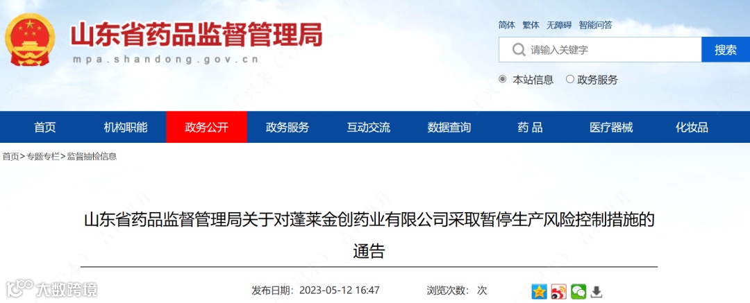 近日,山东药监局发布了1则暂停生产通知,蓬莱金创药业有限公司违反《药品生产质量管理规范》(2010年版)的规定,被暂停生产。