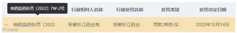 2022年12月14日,安徽药监局发布了行政处罚通知,安徽长江药业生产、销售的马来酸氯苯那敏片经江西省樟树市药品检验所检验溶出度不符合规定、申请中检院复检后溶出度仍不符合规定,企业被处罚480835.02元
