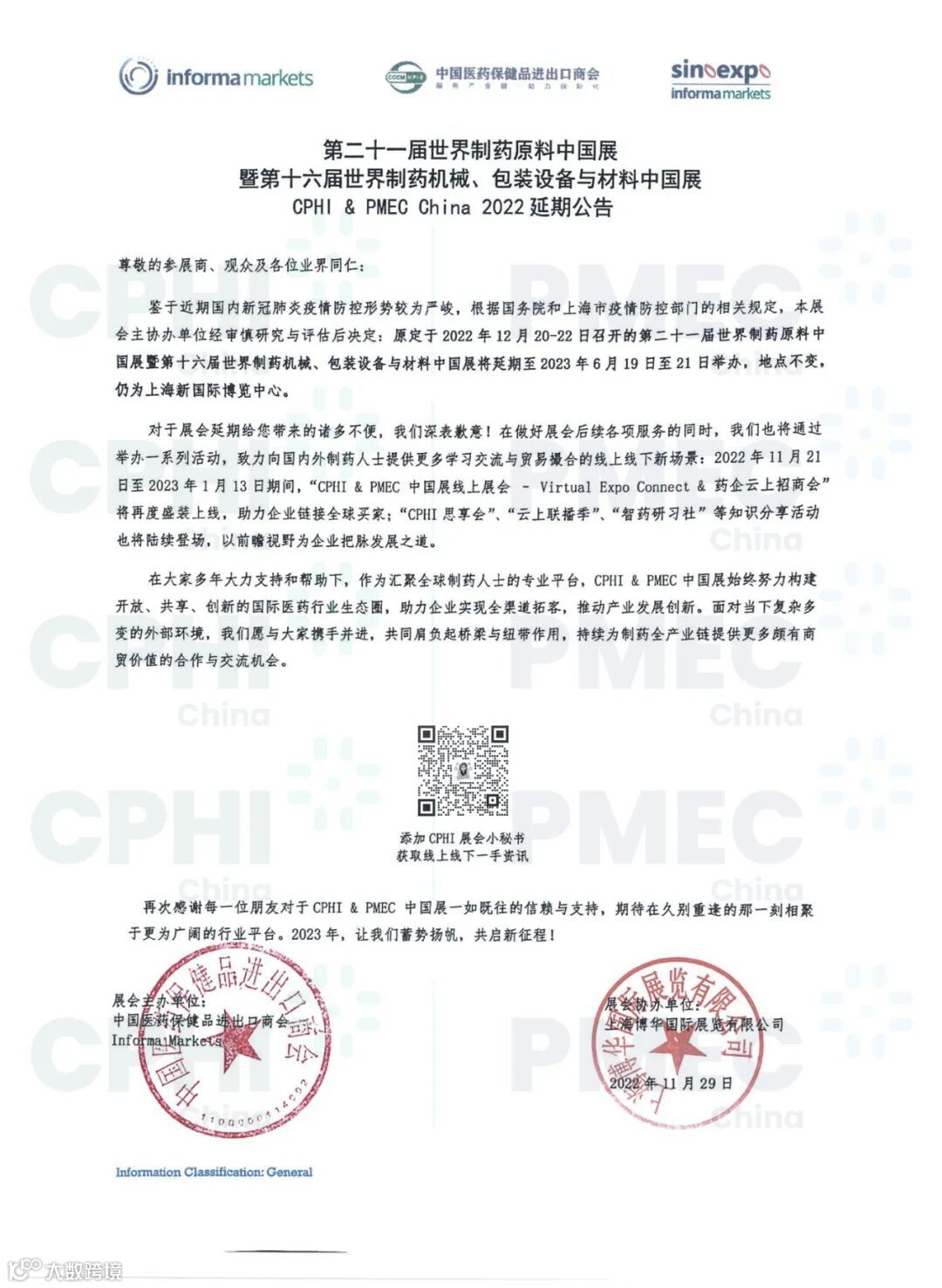 鉴于近期国内新冠肺炎疫情防控形势较为严峻,根据国务院和上海市疫情防控部门的相关规定,本展会主协办单位经审慎研究与评估后决定:原定于2022年12月20-22日召开的第二十一届世界制药原料中国展暨第十六届世界制药机械、包装设备与材料中国展将延期至2023年6月19日至21日举办,地点不变,仍为上海新国际博览中心。