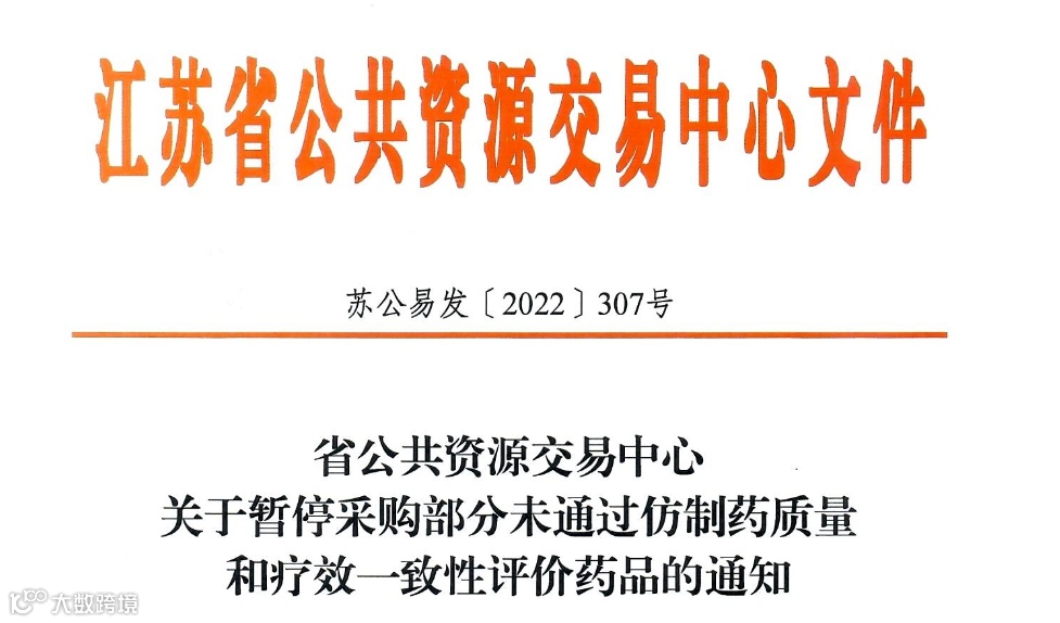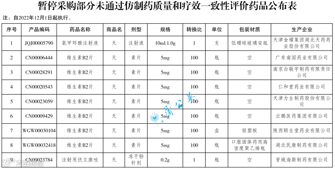 2022年11月24日,江苏省公共资源中心发布了未通过一致性评价的仿制药暂停采购通知,涉及3个品种氨甲环酸注射液、维生素B2片和注射用伏立康唑,共计9个文号、12月1日开始执行。