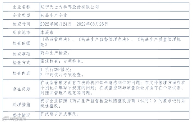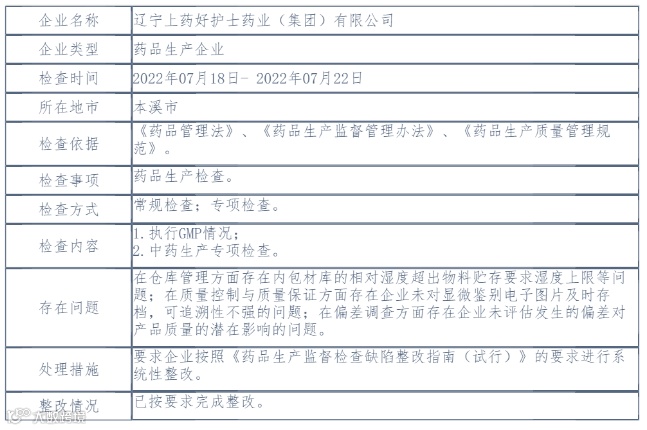 2022年12月09日辽宁药监局发布了药品企业检查结果公示,共计涉及2家企业,分别为辽宁上药好护士药业(集团)有限公司和辽宁天士力参茸股份有限公司,共计发现6类问题。
