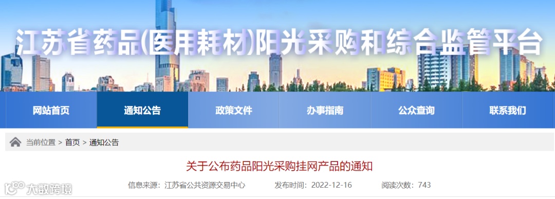 导读:2022年12月16日,江苏省公共资源中心发布了1则《关于公布药品阳光采购挂网产品的通知》,本次通知涉及89