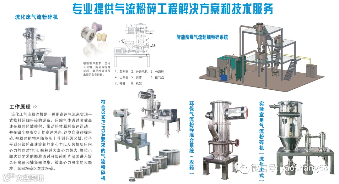 公司致力于气流粉碎机、气流分级机等超细粉体设备的开发和生产,主要产品包括:粉体整体解决方案,粉体工程方案设计、安装调试、运行与改造,流化床气流粉碎机、圆盘式超音速气流粉碎机、气流分级机、符合GMP/FDA要求的医药食品级气流粉碎机、惰性气体保护粉碎生产线,球磨、振动磨粉碎生产线,超微粉碎生产线,智能环保型农药粉碎混合系统及智能防爆型气流粉碎装备系统;同时,我公司提供多种粉体材料的生产经销与代加工
