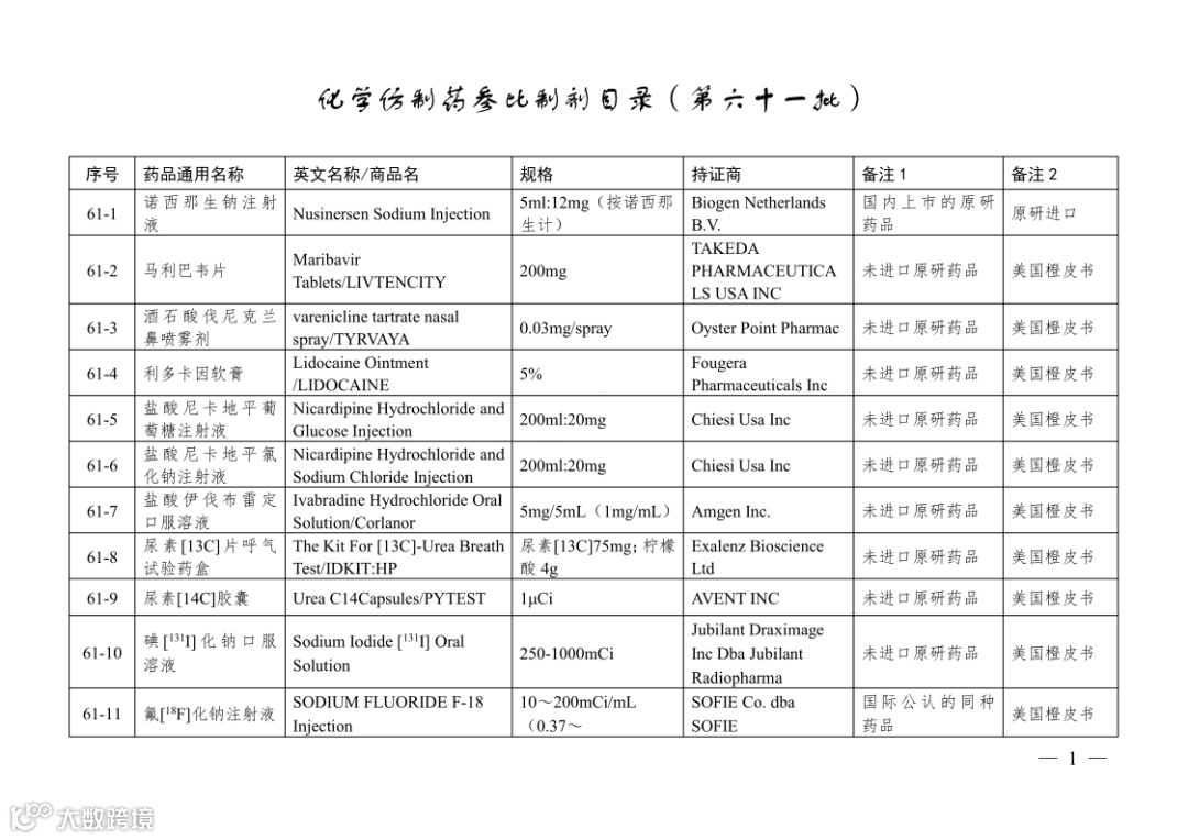 经国家药品监督管理局仿制药质量和疗效一致性评价专家委员会审核确定,现发布仿制药参比制剂目录(第六十一批)。